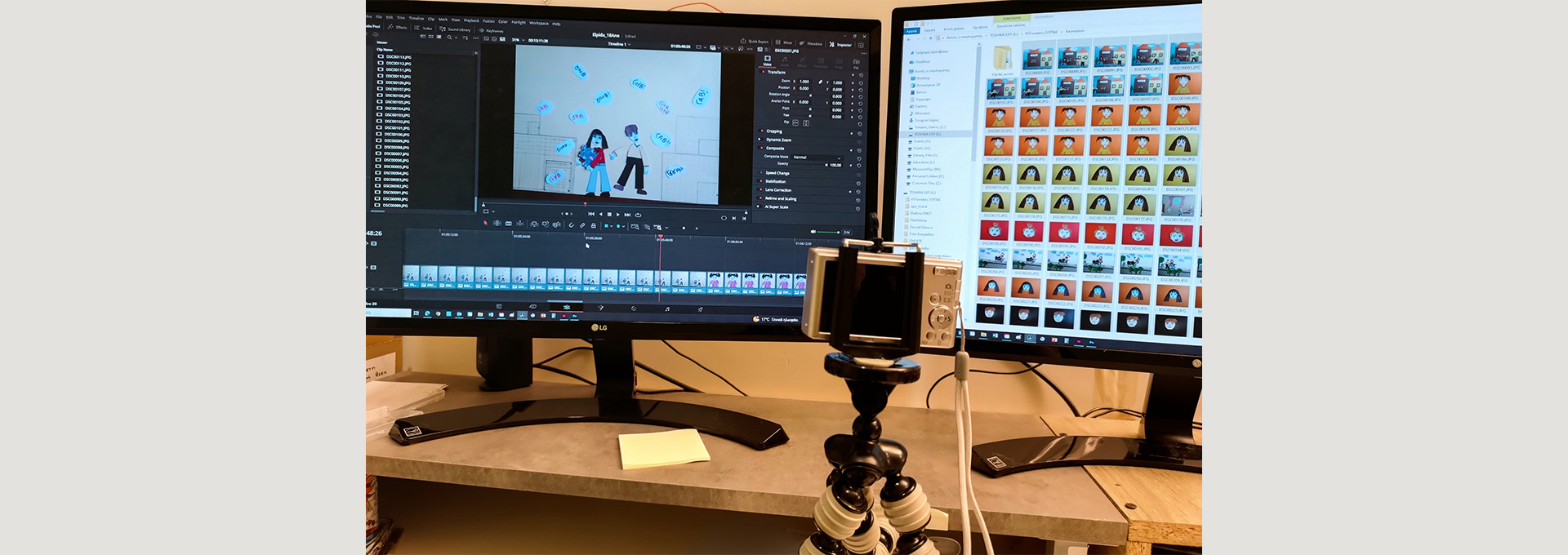 Using a variety of materials, such as white and coloured paper, cardboard, markers, and glue, the characters and sets of the story were constructed. This was followed by a series of photographic shots, recordings of dialogue and ambient sounds, in order to gather the necessary material, which was then uploaded to an application for the completion of the short animation film.