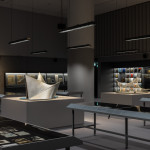 The exhibition space is structured around four columns that create an internal subspace containing display cases with Xenakis’s archive and architectural props. Laboratory-style lighting fixtures that are arranged crosswise form a horizon above the showcases. The vertical pedestals form additional subspaces with sound-absorbing material that house Xenakis’s sound events.